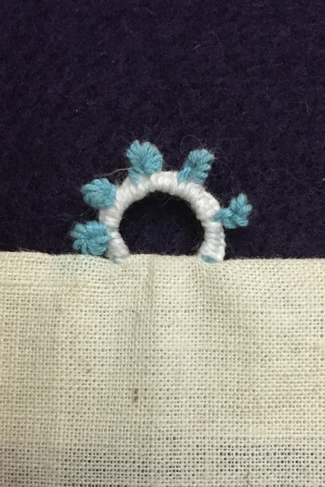 I started with the black lines first using a split stitch. Many of the lines went almost straight across the piece making good base lines to work from and outlining some large areas making them easy to fill in. I am not going to outline the whole picture in black it would get messy once I got to the trees. The black lines are spaces between the boards that appear black in the picture.